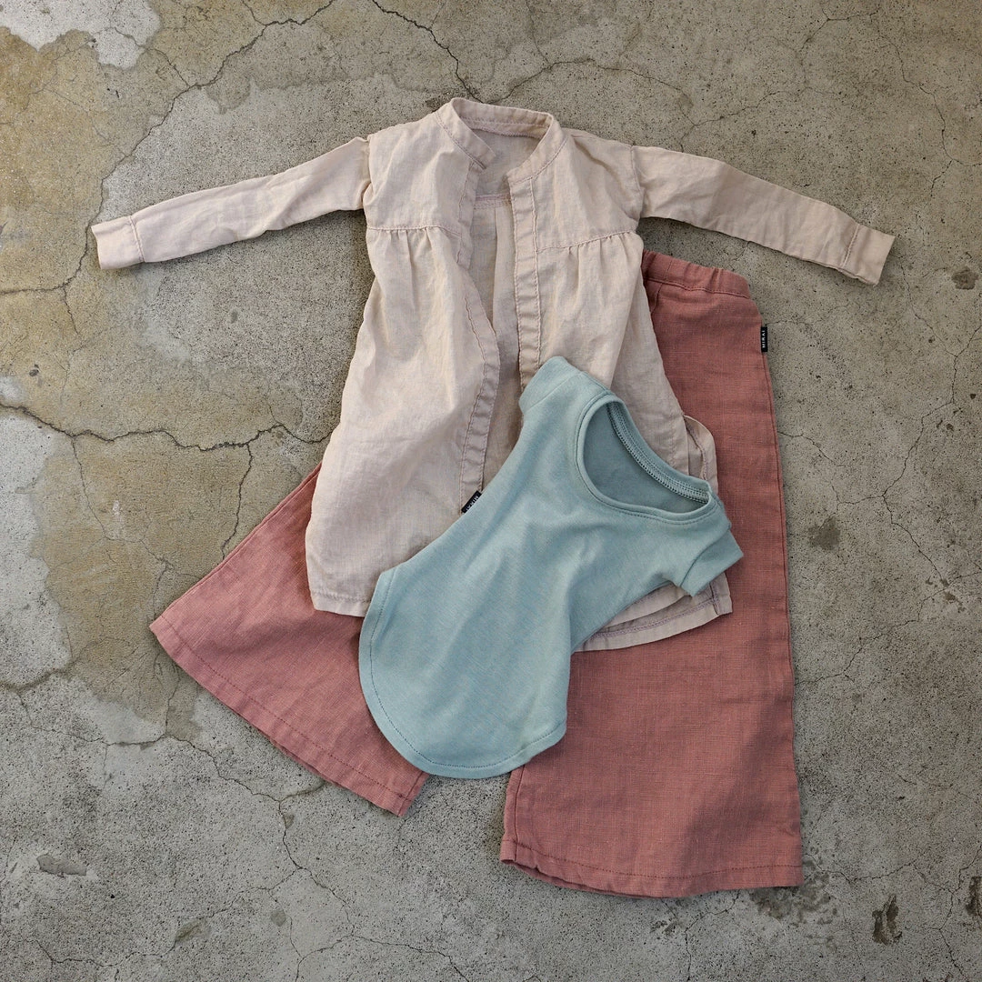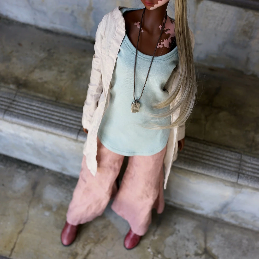 The outer shirt and wide flare bottoms have gone through a weathering and bio wash to give them a soft natural wrinkly look. While the three items look great together, the baggy T-shirt looks great on its own with a pair of panties when lounging around at home or with a pair of jeans.